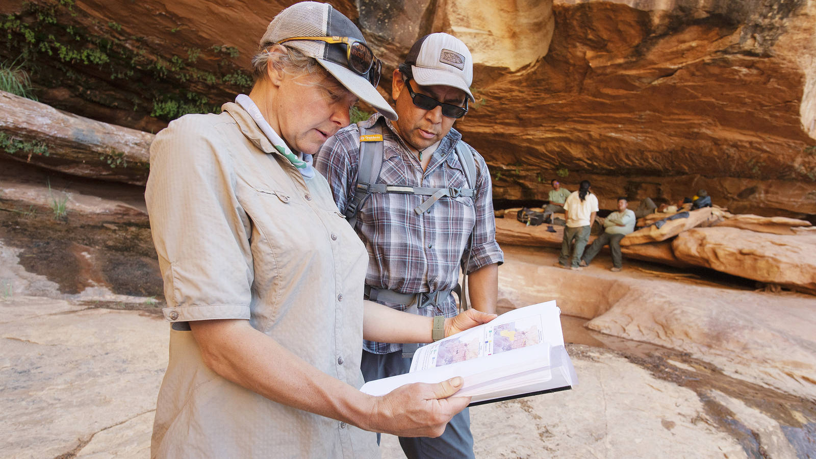 That first day, the crew sat in an alcove around a natural spring to cool off after the hike. Water seeped through the sandstone ceiling, nourishing some ferny green plants before trickling down to a little pool inhabited by a few water striders. The crew joked about their difficult “commute” and introduced themselves.