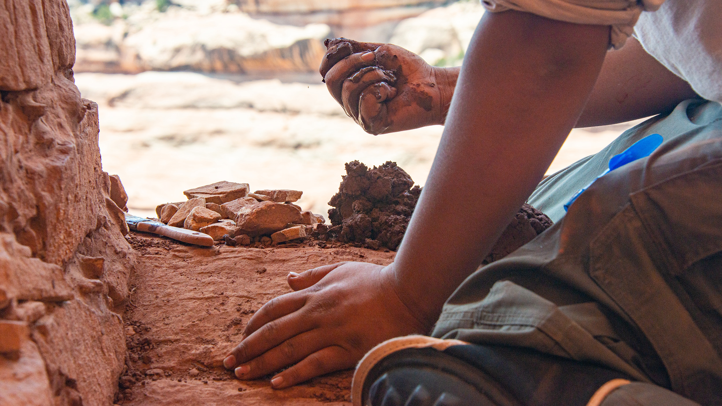 They were working to stabilize Ancestral Puebloan structures built by their ancestors long ago. Thirty-year-old Kendrick Nahohai, the crew leader, laid on his belly with his feet pointed downslope toward the cliff. He rolled a bit of clay into a ball, squeezed it in his hand, then pressed it between stone blocks in the wall to replace missing mortar. With his thumb, he adjusted the texture so that it matched the look of the original mortar.