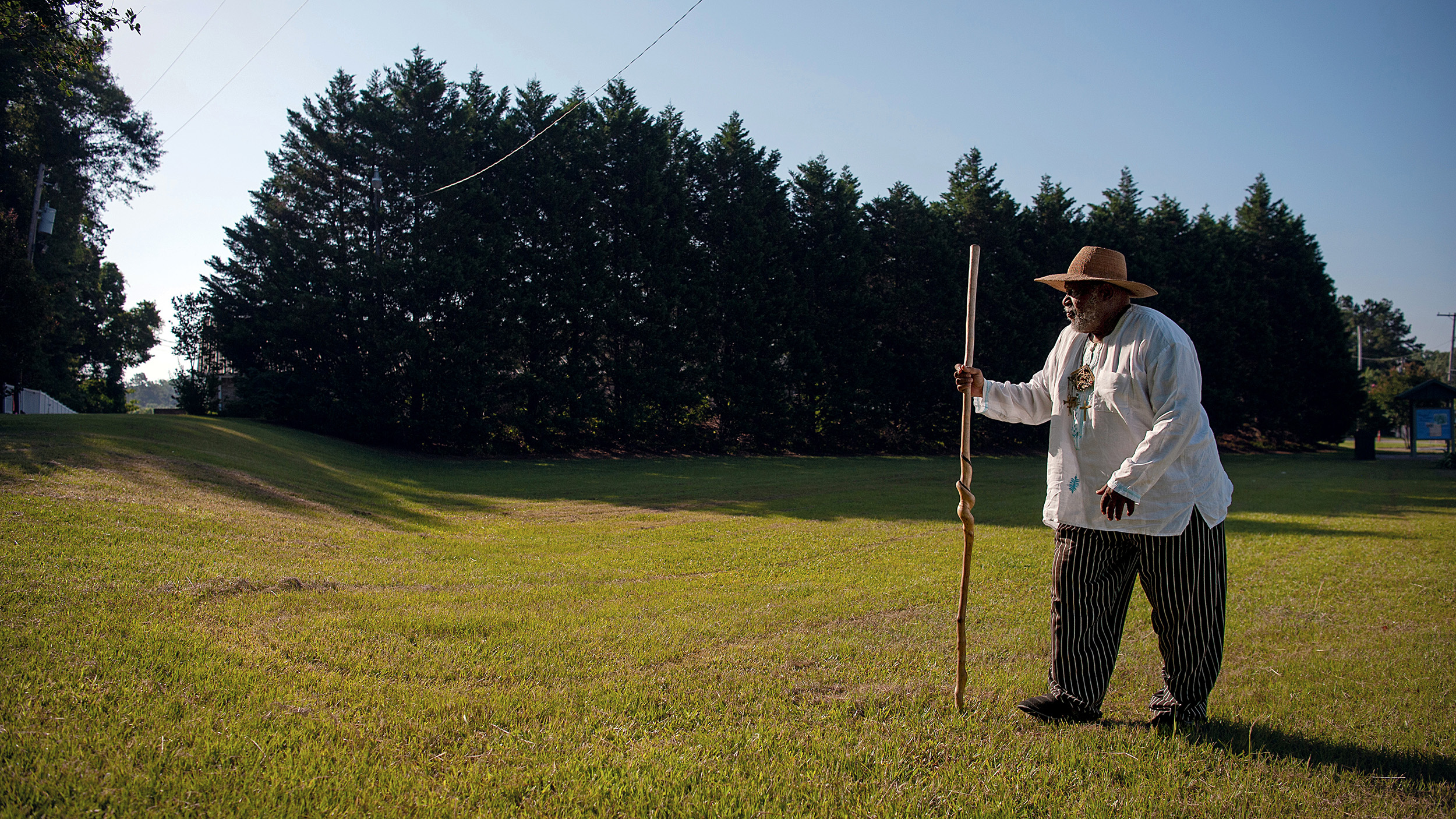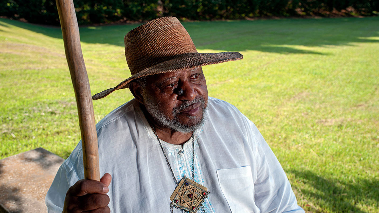 ©RORY DOYLEThat full story — or at least critical parts of it — might have been lost forever were it not for Ser Seshsh Ab Heter-C.M. Boxley, whom I arranged to meet at Forks of the Road. When I arrived, Ser Boxley, born Clifford M. Boxley, was sitting on a granite bench under a row of young crepe myrtles, looking across the spindly grass. Now in his early 80s, he wore an African tunic and black pants with white pinstripes running vertically. Around his neck hung a small leather bag. “Here, people were marketed like cattle and resold into chattel slavery, which benefitted Natchez, Mississippi, and all of America,” he said to me in a deep, booming voice. In his left hand, he held a wooden staff. “Who was telling their story? Who would stand up for them? Who would speak for them?”